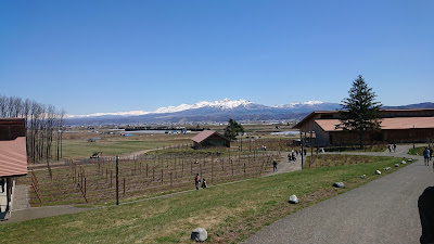 The scenery of Mt. Tokachi-dake and adjacent mountains from there was so nice to see. The vineyard in spring does not make me imagine the bumper crop of the grape in coming autumn.But the small buds on the grapevine looked like the icon of hope for the future with the blue sky and the mountain range topped with white snow.