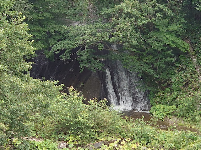 We moved from the lookout for Rarumanai Waterfall to that for Hakusen Waterfall. Hakusen means white handy fan that can be folded. The riverbed is one rock on the ground.